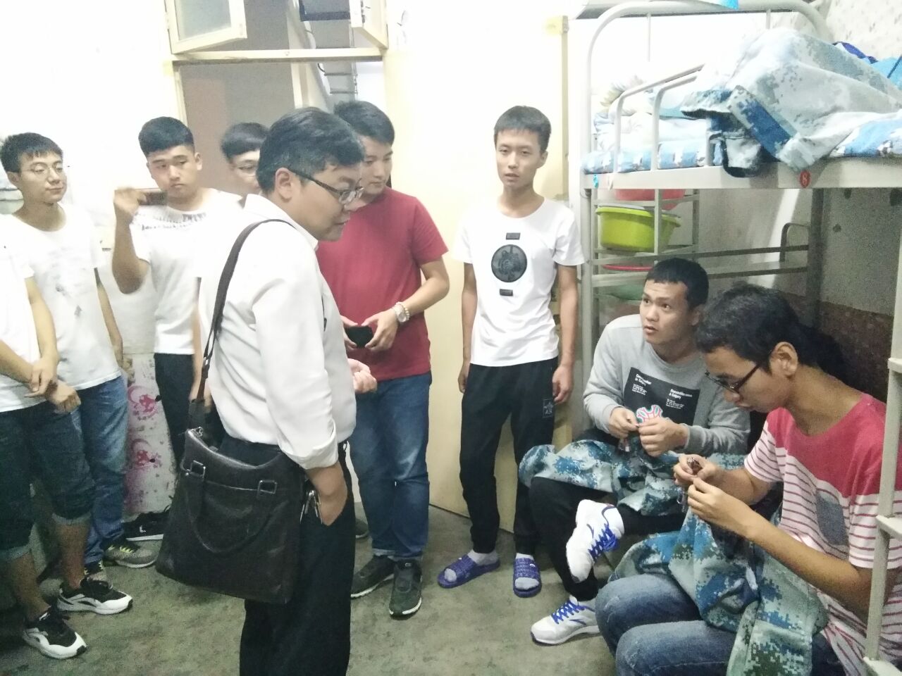 9月6日晚,党总支副书记杨光、学生管理科科长杜长龙及新生辅导员、院学生会干部深入学生宿舍慰问2017级新生。