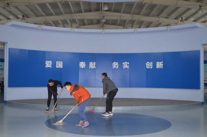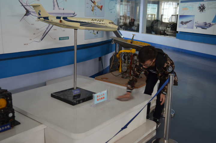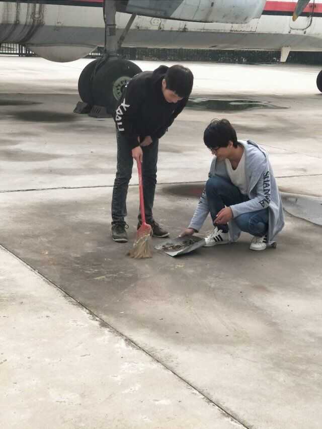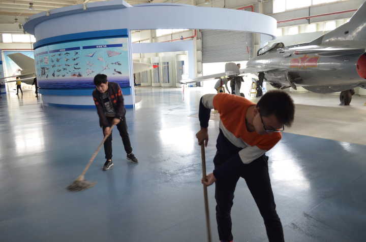 积极分子划分成两组同时进行。一组运用手中工具清理停机坪上的落叶和可见垃圾,另一组同样在航空馆认真细致的擦拭飞机模型,耐心的清理地面。各组成员密切配合,积极参与,在短时间内高质量地完成了本次义务清扫任务。