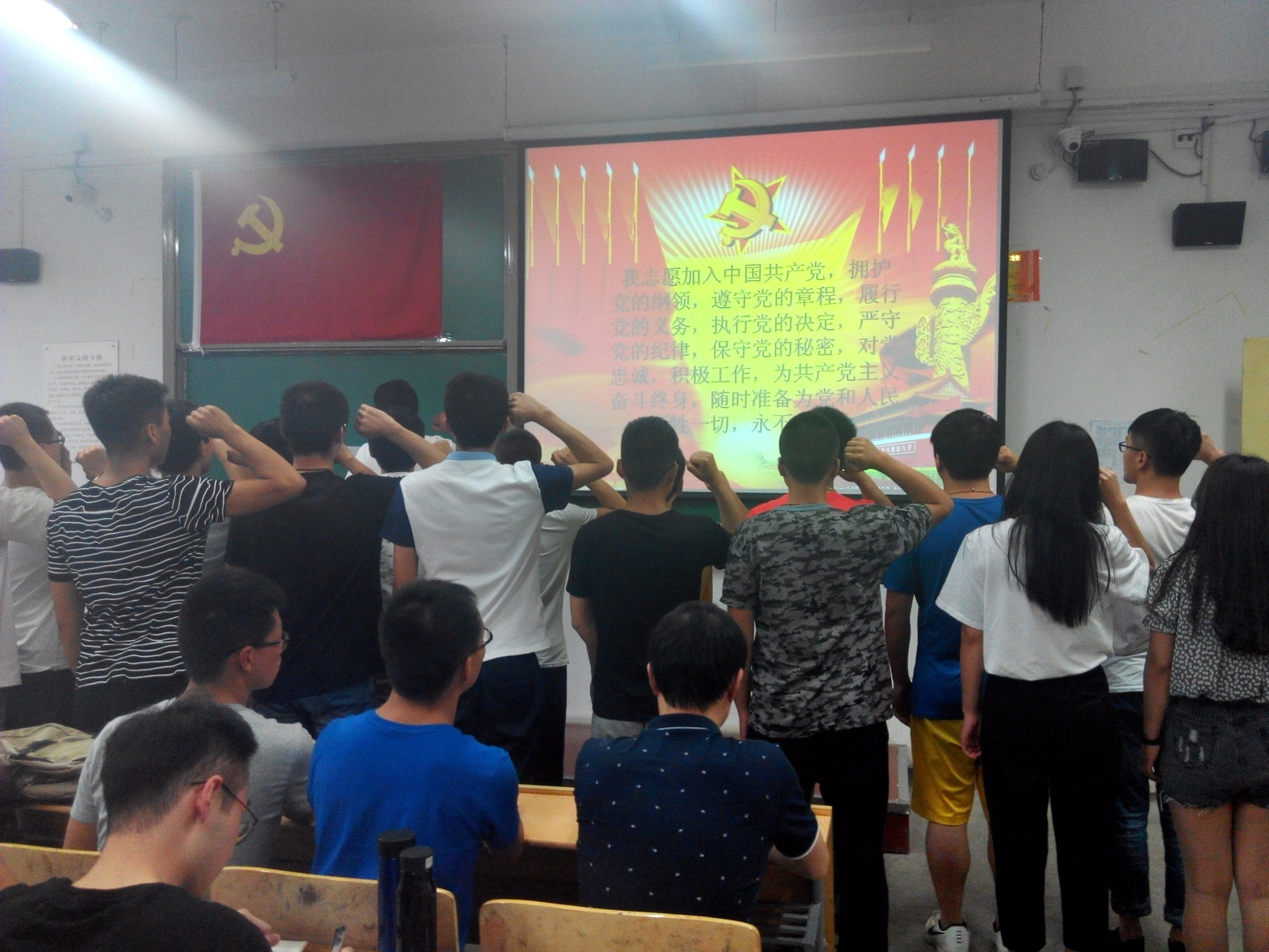 宣誓仪式在《国际歌》声中拉开帷幕。29名预备党员在党员马润涛的领誓下,面向党旗庄严宣誓。“我志愿加入中国共产党,拥护党的纲领,遵守党的章程,履行党员义务,执行党的决定,严守党的纪律,保守党的秘密,对党忠诚,积极工作,为共产主义奋斗终身,随时准备为党和人民牺牲一切,永不叛党。”一声声誓言,告诫着我们的责任;一声声誓言,指明了前进的方向;一声声誓言,激发了我们的斗志。