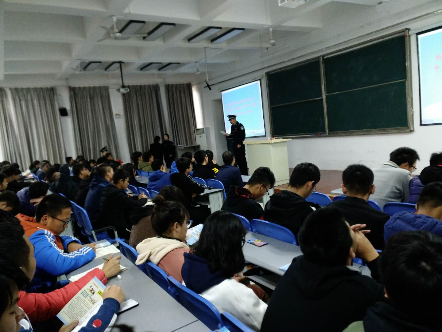会上,保卫处和阎良治安、交警等部门向学生散发了法制意识宣传单,同时从各个角度为同学们讲解安全意识、法制意识建立,预防和及时处理突发事件,同学们认真学习并与宣讲同志交流。