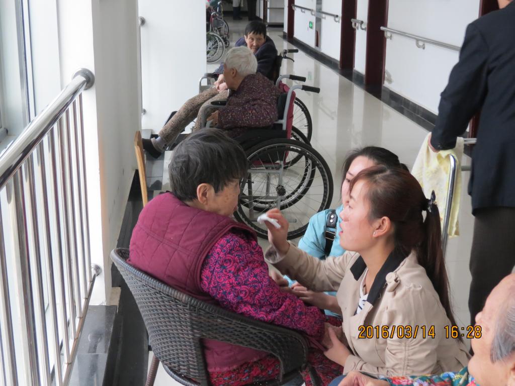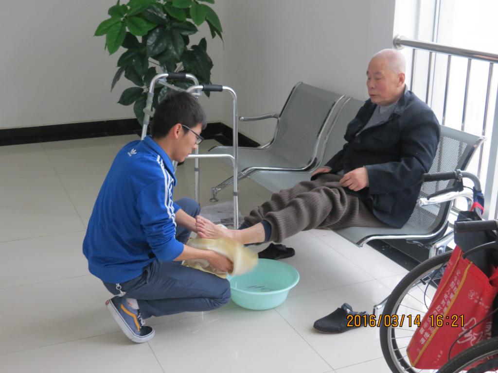 下午3点,志愿者们怀着诚挚的心来到了德瑞养老院,老人们热情的欢迎同学们的到来。他们的到来使原本寂寞的敬老院充满了笑声,同学们分为若干个小组,各有分工。有的帮老人整理内务,打扫卫生;有的为老人沐浴洗脚;有的陪老人聊天,听老人讲讲过去,讨论讨论下当下,不仅使老人摆脱寂寞,也使自己受到了教育;有的还细心的询问了老人的生活情况。不少老人反映,他们在这里的生活就像是在家里一样,被照顾十分贴心。